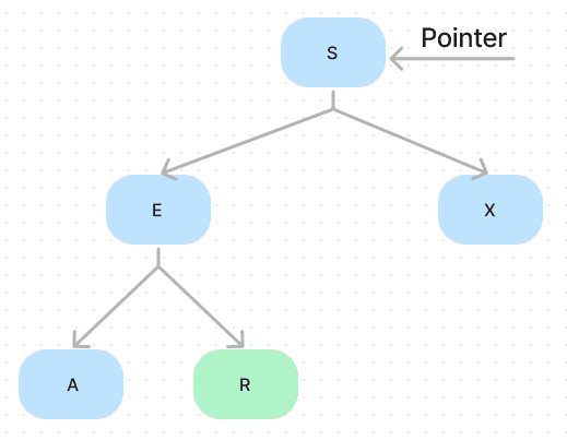 Compare the node's key pointed by the pointer with what we want, noting that . Since in the binary search tree, the nodes' key in the left sub-tree is smaller than the current topped node's key, we can infer that R is never in the right sub-tree. Thus we make the pointer point to the E. Continue the above logic; the pointer will point to the right sub-tree of E. We find, at that moment, it is equal to our target. We're done.