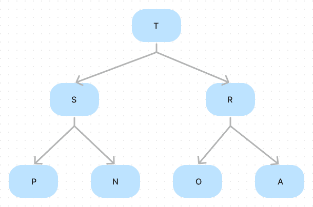 In this tree, we have three leaf nodes, R, P, N; they are heap right now, so we don't need to process them. We can just start from the S. A more general term is, if we want to heapify a tree, we can start from the right-most inner node at the second level from the bottom. And it's very easy to find; suppose the array has elements, and the inner node's index will be . The following is the code: