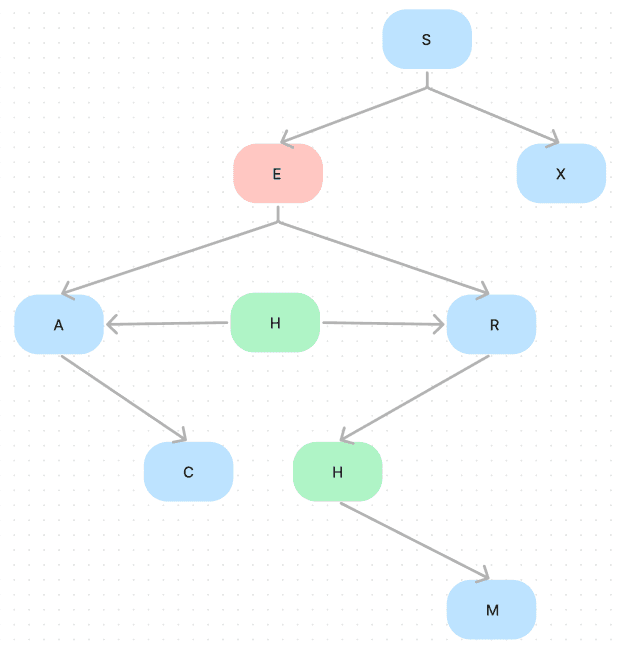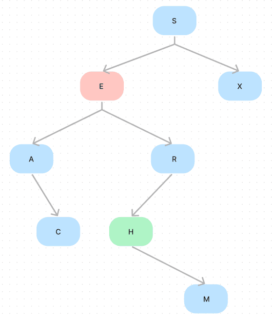 Compare the node's key pointed by the pointer with what we want, noting that . Since in the binary search tree, the nodes' key in the left sub-tree is smaller than the current topped node's key, we can infer that R is never in the right sub-tree. Thus we make the pointer point to the E. Continue the above logic; the pointer will point to the right sub-tree of E. We find, at that moment, it is equal to our target. We're done.