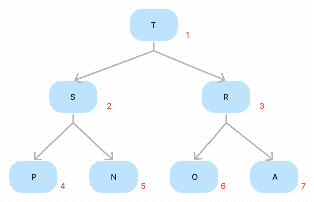 In this tree, we have three leaf nodes, R, P, N; they are heap right now, so we don't need to process them. We can just start from the S. A more general term is, if we want to heapify a tree, we can start from the right-most inner node at the second level from the bottom. And it's very easy to find; suppose the array has elements, and the inner node's index will be . The following is the code: