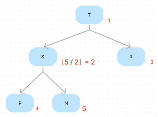 But we notice that the heap is a complete binary tree, so we can use an array to store it actually. If we do that, the parent of the node in position is in position and, conversely, the two children of the node in position are in positions and .